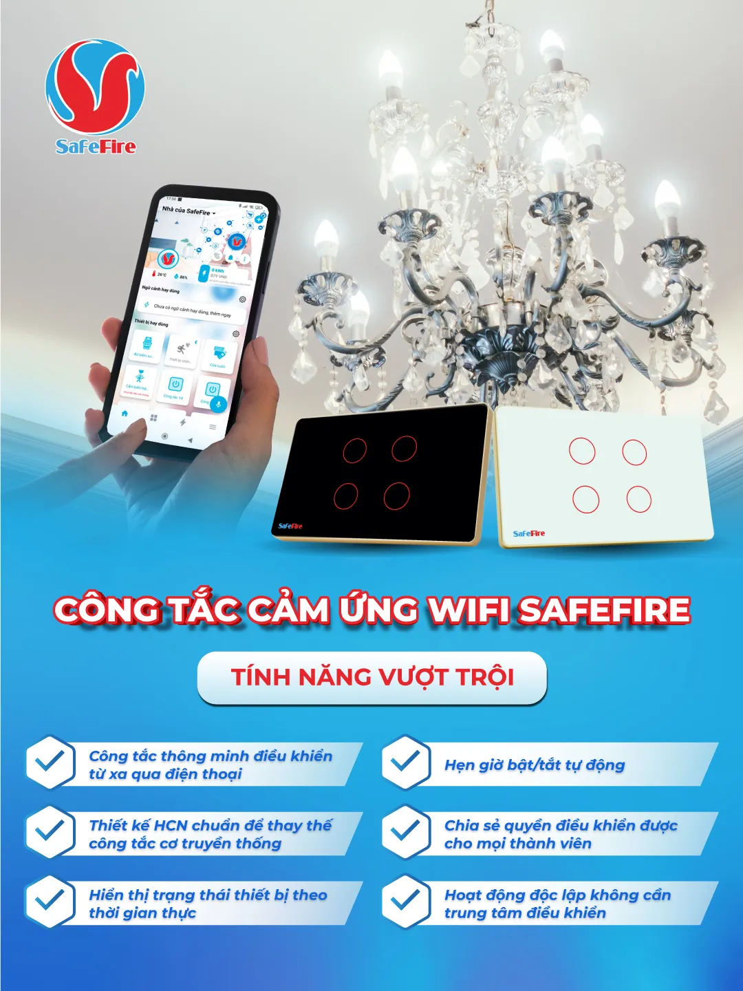 Công tắc cảm ứng WiFi SafeFire là giải pháp hoàn hảo để nâng cấp không gian sống của bạn. Từ điều khiển linh hoạt, hẹn giờ thông minh đến tính năng chia sẻ tiện lợi – tất cả đều hội tụ trong một sản phẩm nhỏ gọn, tinh tế. Chọn phiên bản phù hợp (3 nút hoặc 4 nút, chống giật, màu đen hoặc trắng) để biến căn nhà của bạn trở thành ngôi nhà thông minh thật sự.