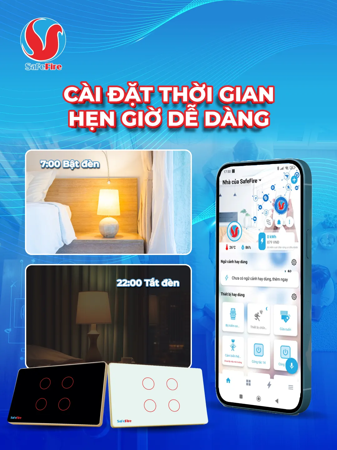 Bạn muốn đèn hành lang bật vào lúc 6h tối và tắt lúc 11h đêm? Hay muốn phòng ngủ sáng lên lúc 7h sáng để đánh thức bạn nhẹ nhàng? Tất cả đều có thể với công tắc cảm ứng wifi SafeFire.