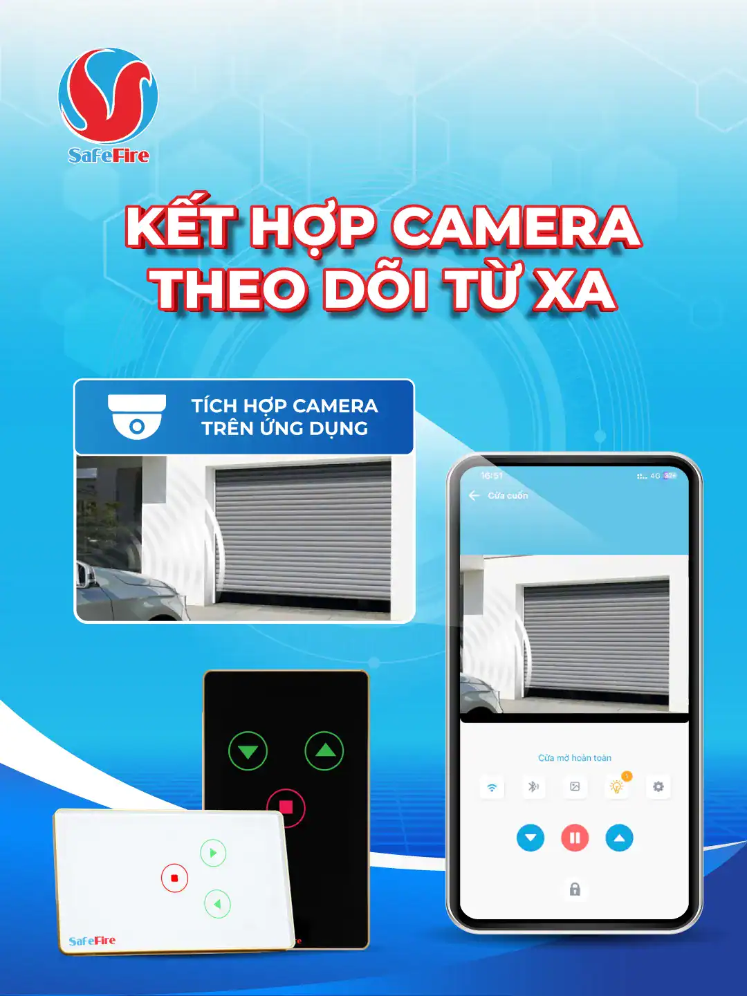 Đặc biệt, công tắc cửa cuốn wifi SafeFire cho phép tích hợp camera trên ứng dụng. Bạn có thể quan sát tình trạng khu vực cửa cuốn qua camera trong khi đang điều khiển cửa cuốn. Điều này sẽ giúp bạn quản lý và điều khiển cửa cuốn tại nhà thông minh hơn, cho dù bạn không có ở nhà.