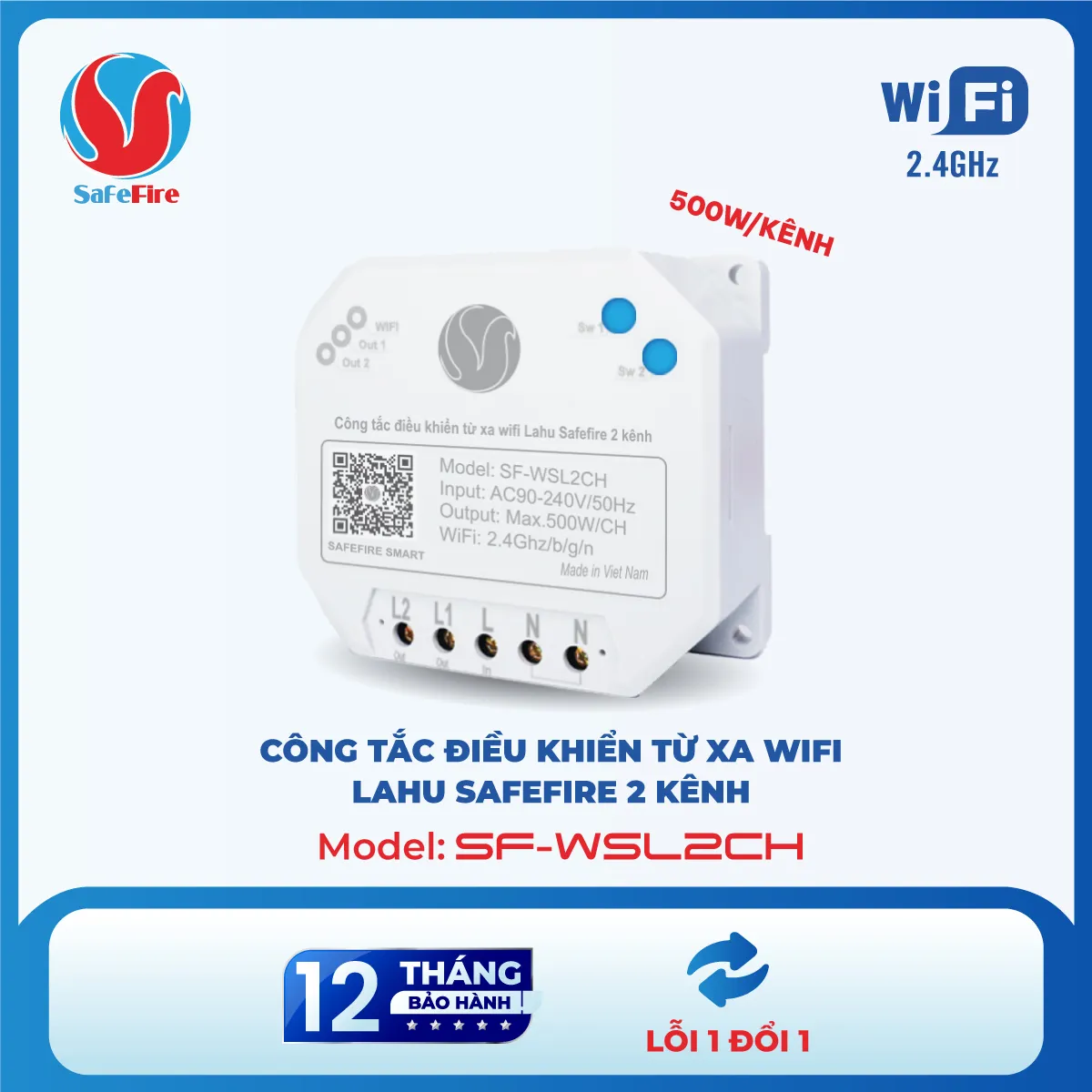 - Công tắc điều khiển từ xa wifi Lahu SafeFire 2 kênh ( Model: SF-WSL2CH): Có công suất mỗi kênh 500W