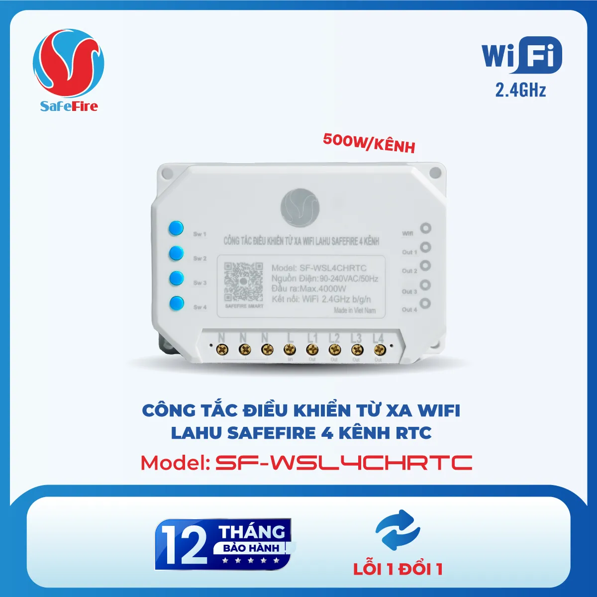 - Công tắc điều khiển từ xa wifi Lahu SafeFire 4 kênh RTC (Model: SF-WSL4CHRTC): Tích hợp IC thời gian thực. Công tắc có 4 kênh, công suất 500W/kênh.