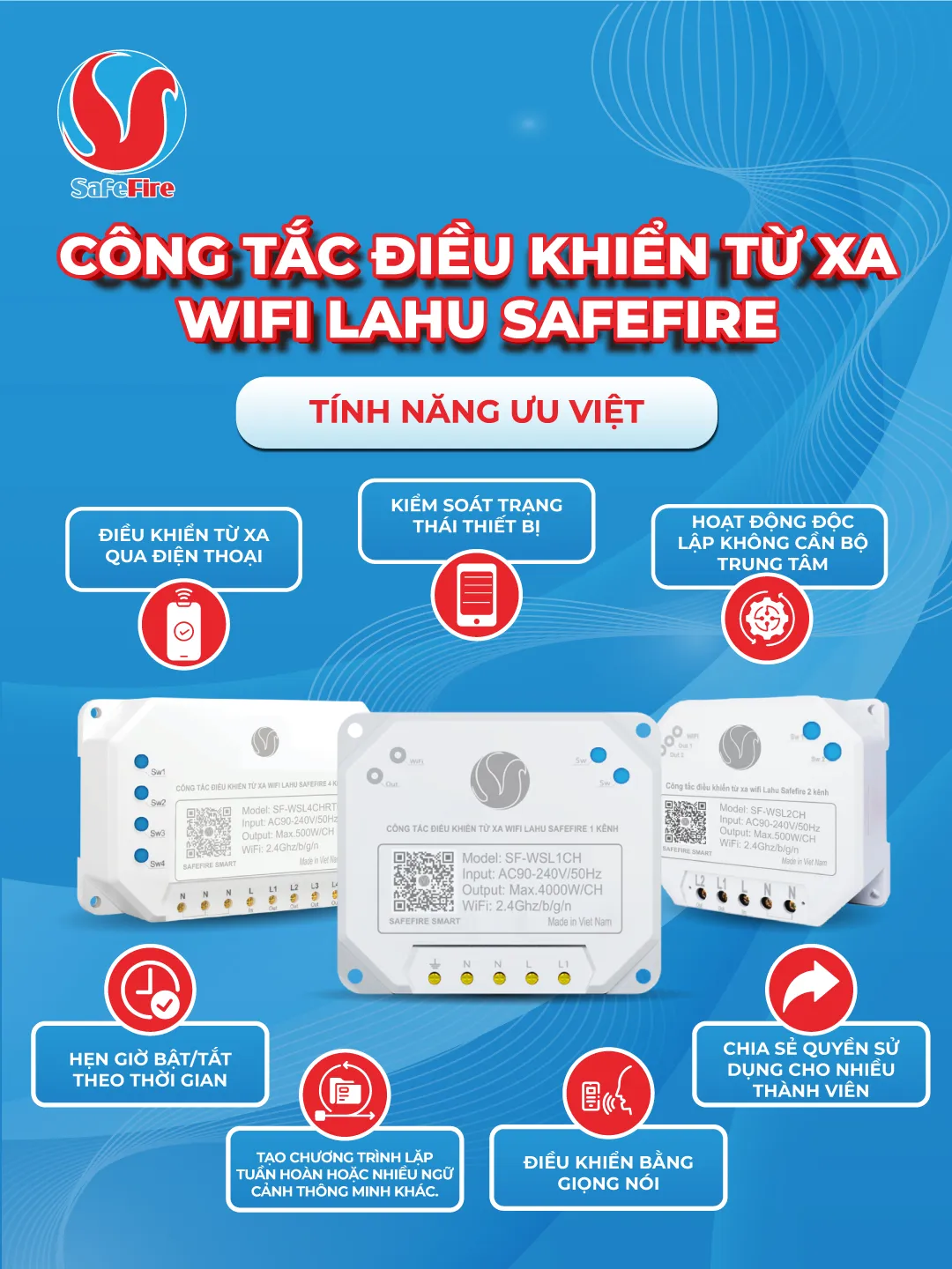 - Công tắc điều khiển từ xa wifi Lahu SafeFire 1 kênh (Model: SF-WSL1CH): Với công suất lên đến 4000W, phù hợp với những thiết bị có công suất lớn như máy bơm.