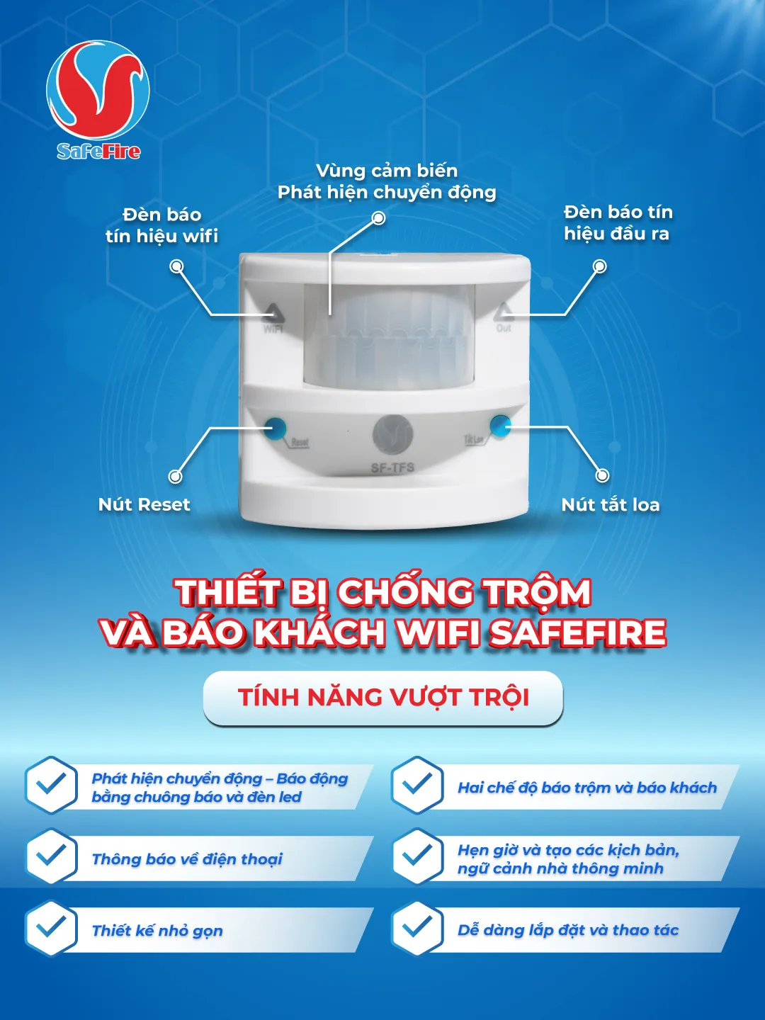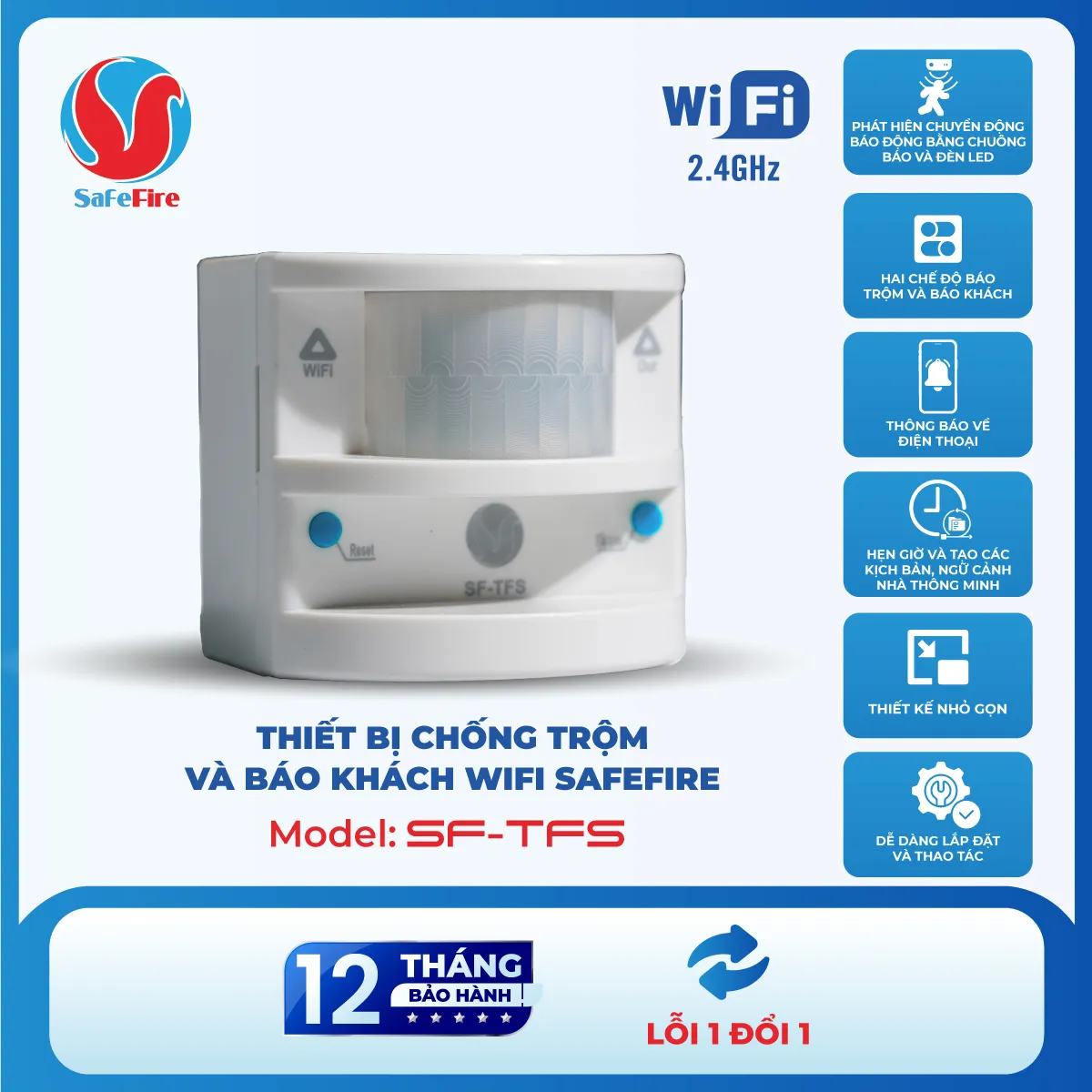 Thiết bị chống trộm và báo khách wifi SafeFire SF-TFS không chỉ là một sản phẩm công nghệ an ninh – mà còn là giải pháp bảo vệ toàn diện cho ngôi nhà, cửa hàng và văn phòng hiện đại. Với thiết kế nhỏ gọn, dễ lắp đặt, hoạt động thông minh và khả năng kết nối từ xa qua ứng dụng, sản phẩm giúp bạn vừa kiểm soát an ninh, vừa tiếp đón khách chuyên nghiệp mọi lúc, mọi nơi.